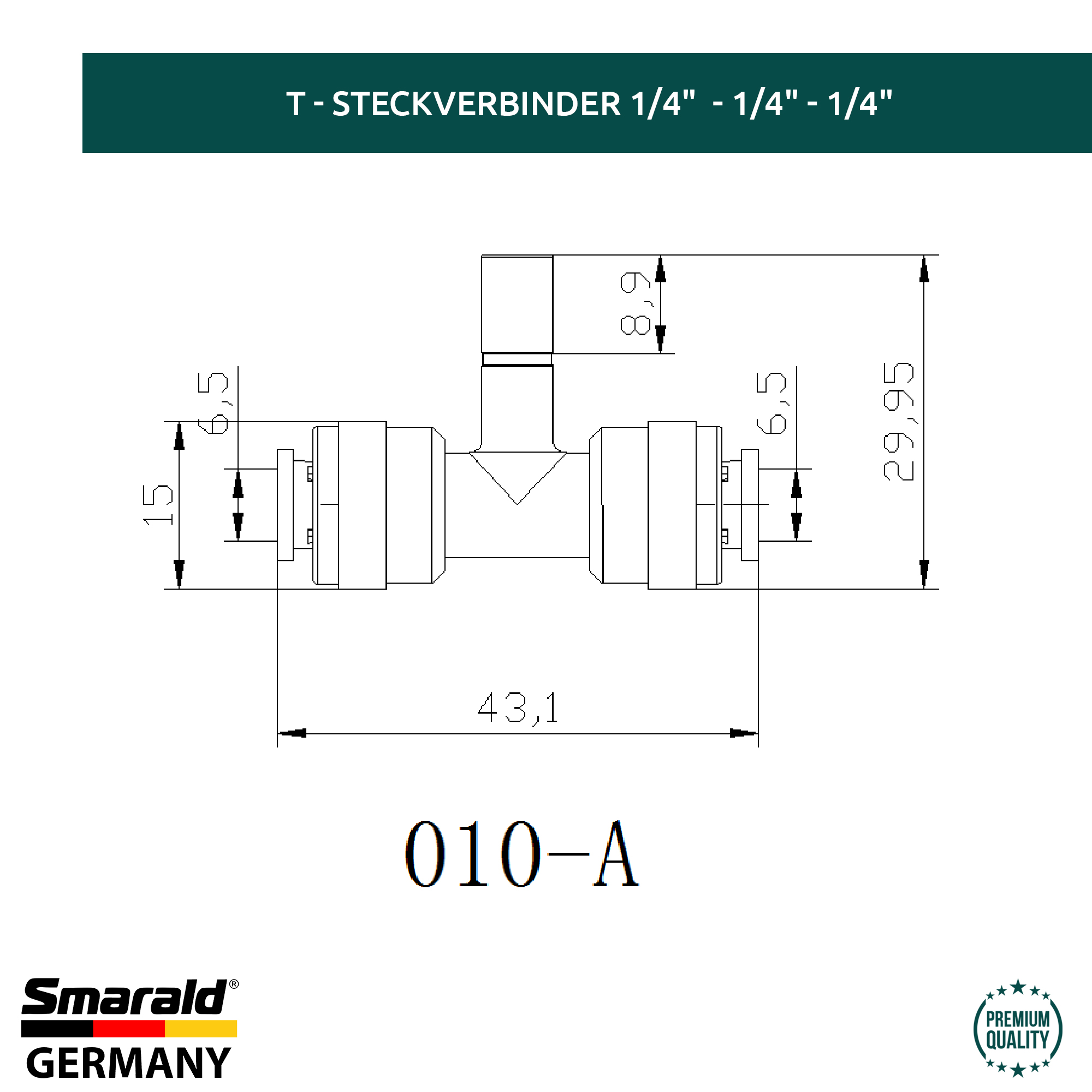T-Steckverbinder 1/4" - 1/4" - 1/4" Fitting für Umkehrosmose Wasserfilter Aquarium
